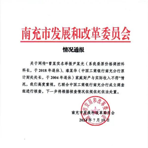 7月19日记者电话采访了南充市发改委,工作人员表示被举报人确实是他们单位的,但已退休多年,目前已针对此事开始调查。