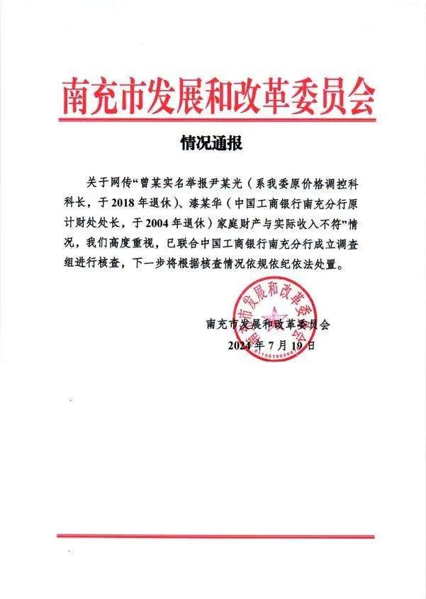 南充市发改委7月19日通报称,高度重视网传事件,已联合中国工商银行南充分行成立调查组进行核查,下一步将根据核查情况依规依纪依法处置。