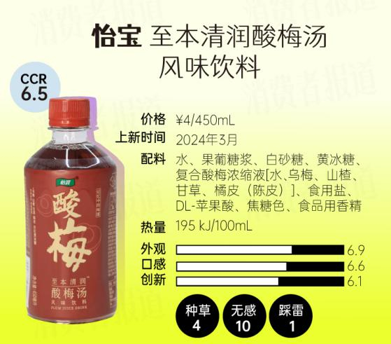 当年轻人爱上中式养生,主打“药食同源”的酸梅汤赛道受到追捧,康师傅、统一、王老吉、健力宝、大窑等企业纷纷布局。怡宝推出的至本清润酸梅汤,据称是采用乌梅、山楂、甘草、陈皮、黄冰糖传统原料,经2小时以上浸泡细熬,口感层次丰富。