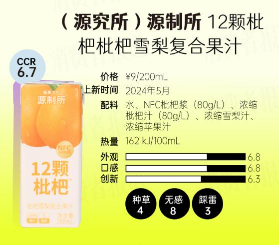 “源究所”是果原力(北京)生物科技有限公司旗下品牌,成立于2021年,专注研发纯果蔬、无添加的功能性软饮,产品已入驻全家、罗森、7-11等数万家终端门店。源究所自2021年12月上线首款产品“蓝莓汁”,SKU数至今已增至数款。新品“12颗枇杷”以福建云霄早钟六号枇杷和雪花梨为主要配料,添加有NFC枇杷原浆,官方称一瓶约等于12颗枇杷。