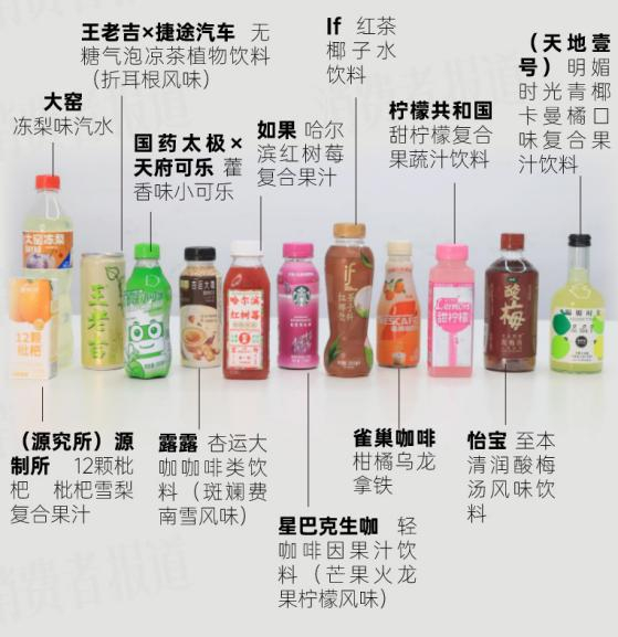 (天地壹号)明媚时光青椰卡曼橘口味复合果汁饮料、露露 杏运大咖咖啡类饮料(斑斓费南雪风味)、柠檬共和国 甜柠檬复合果蔬汁饮料、如果 哈尔滨红树莓复合果汁、怡宝 至本清润酸梅汤风味饮料、大窑 冻梨味汽水、雀巢咖啡 柑橘乌龙拿铁、国药太极×天府可乐 藿香味小可乐、If 红茶椰子水饮料、王老吉×捷途汽车 无糖气泡凉茶植物饮料(折耳根风味)、源制所 12颗枇杷 枇杷雪梨复合果汁、星巴克生咖 轻咖啡因果汁饮料(芒果火龙果柠檬风味)
