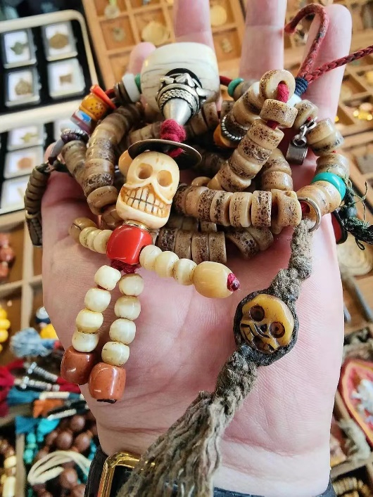 不攀比材质的名贵,不跟风千篇一律的潮流,不追求刻板的传统形制……现在,越来越多的“文玩青年”将珠串视作记录生活的“美好手账”。老钥匙、铜纽扣、旅行时捡到的小石头、碎瓷片,甚至骨折痊愈后取下的钢板、孩子的乳牙、已逝爱宠的毛发都成为珠串上的配饰,这些充满人情味和无限回忆的物品点缀在珠串之上,仿佛将昔日的温暖与美好回忆凝固成永恒,随身佩戴如影随形,睹物思人美好回忆萦绕心间。
