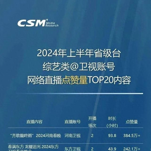 从2024年上半年省级综艺类卫视账号网络直播传播情况看,广西卫视网络直播点赞量超过600万,位列省级卫视第三位,仅次于河南卫视、东方卫视。