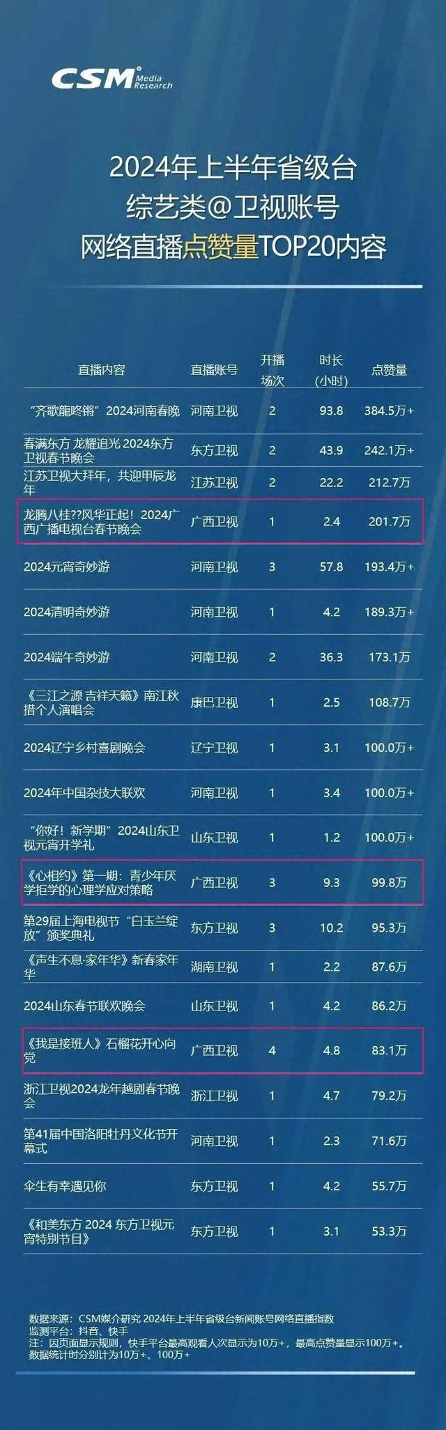 根据索福瑞CSM媒介研究数据,广西卫视《龙腾八桂 风华正起:2024广西广播电视台春节晚会》《第1期心相约:青少年厌学拒学的心理学应对策略》《我是接班人:石榴花开心向党》三场网络直播,跻身2024年上半年省级台综艺类卫视账号网络直播点赞量TOP20。