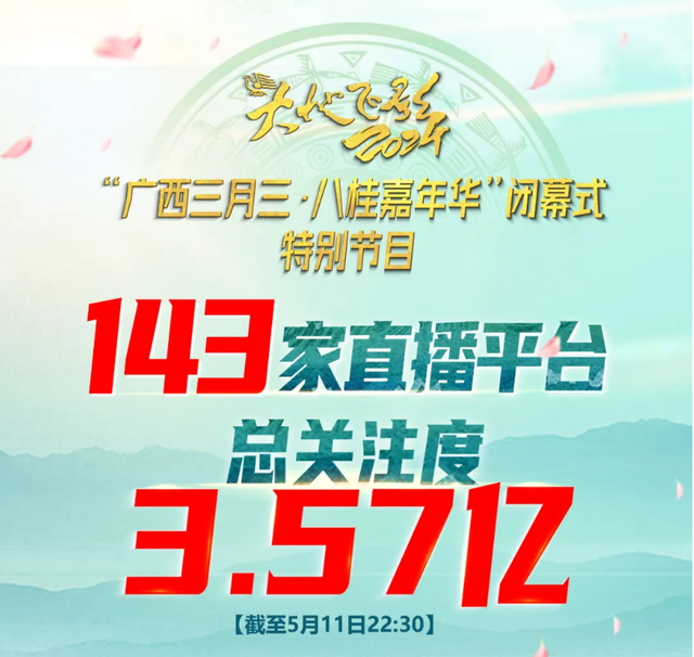 5月11日播出的《“广西三月三·八桂嘉年华”闭幕式暨“大地飞歌·2024”》特别节目,为“广西三月三·八桂嘉年华”文化旅游品牌活动划上圆满句点。据不完全统计,截至5月11日22:30,广西卫视联动的143家直播平台总关注度达3.57亿