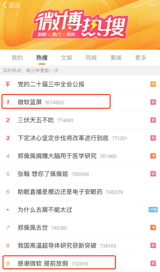 7月19日,话题“微软蓝屏”冲上热搜第一,大量网友晒图显示,公司电脑出现蓝屏,提示电脑遇到问题,需要重新启动。