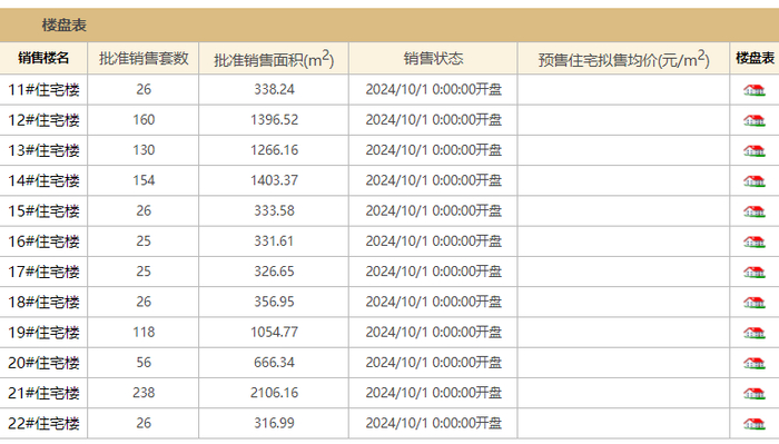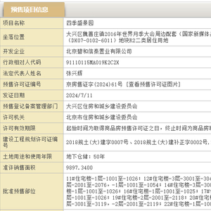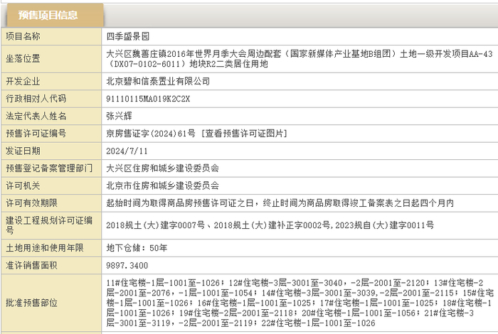 据北京市住建委官网,保利首开·熙悦新语(备案名四季盛景园)于2024年7月11日取得预售许可证,推出12栋楼共1010套房源,销售面积9897.34m²,预计10月1日开盘。