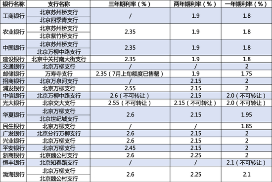 《财经》于7月上旬调查位于北京的6家国有大行、12家股份制银行近25个网点发现:农业银行、中国银行、建设银行等大行依然发售三年期大额存单,年化利率为2.35%;中信银行、光大银行、平安银行、广发银行、兴业银行等股份行三年期大额存单利率在2.45%-2.6%之间;工商银行、招商银行、民生银行等机构已停发上述产品。