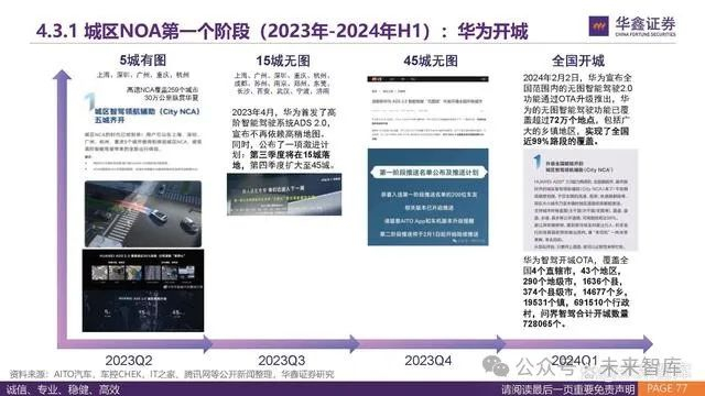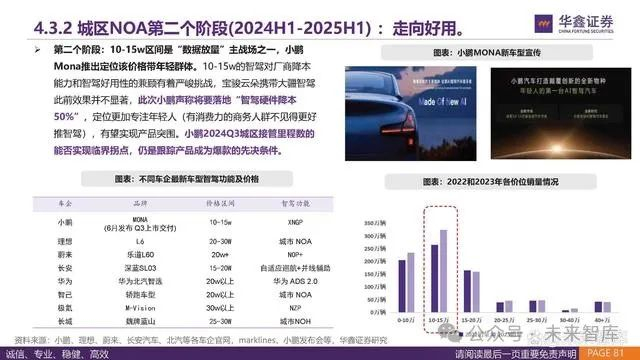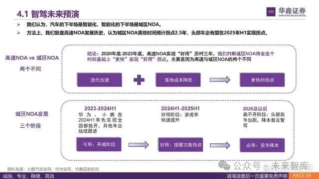 我们认为,汽车的下半场是智能化,智能化的下半场是城区NOA。 方法上,我们复盘高速NOA发展历史,认为城区NOA落地时间预计拐点2.5年,头部车企有望在2025年H1实现拐点。