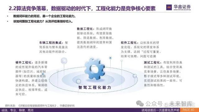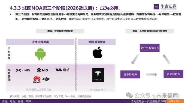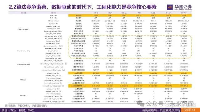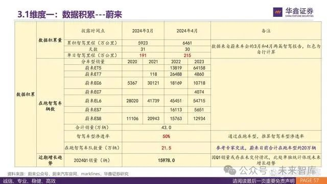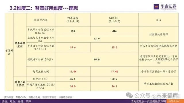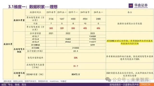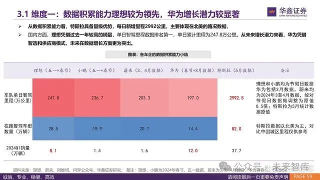 从数据积累能力看,特斯拉具备量级优势,每日新增里程2992公里,主要体现在北美的路况数据。 国内方面,理想凭借过去一年较高的销量,单日智驾里程数据排名第一,单日累计里程为247.8万公里。从未来增长潜力来看,华为凭借 智选和供应商模式,未来在数据增长方面更为突出。
