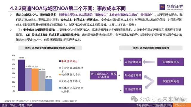 当进入城区NOA,低速情景居多,消费者主要关心点从高速的“事故发生”本身走向事故发生后的” 责任划分”。对于消费者而言,我 们认为事故成本主要可以归为三类:安全成本+时间成本+经济成本。安全成本指的是事故本身对自己和其他人造成的危险,时间和经济 成本指消费者需要处理事故的时间和财力。城区NOA的事故成本有望降低,主要由以下几个因素: (1)安全成本由低速情景缓和:由高速NOA走向城区NOA,高速情景居多走向低速情景居多,人身安全后果的严重性和损害程度有望 降低。(2)经济成本和时间成本将由政策法规补偿:未来随着政策法规的完善,参考海外政策趋势,对消费者的保护逐渐加深会成为政 策未来主要走向之一,有望逐渐降低时间和经济成本。
