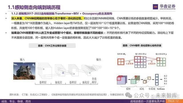 深入来看,CNN神经网络的效率核心在于卷积+池化的过程。相比全连接DNN神经网络,CNN需要训练的参数数量明显减少。举例来说, 一幅像素为1K*1K的图像作为输入,Hidden layer有1M节点,仅一层就有10^12个权重需要训练,如果使用CNN网络,采用100*100的卷 积核,共使用100个卷积核,输入到Hidden layer的参数便降低到了100*100*100=10^6个。 如果说CNN将管理100人的工作变成管理10个组长,那卷积核就像不同的组长 :不同的卷积核代表了不同的特征提取能力。该结构上下层 不再直接全部连接,同一层将共用单个或一定数量的卷积核,因此大大减少了训练权重的数量。