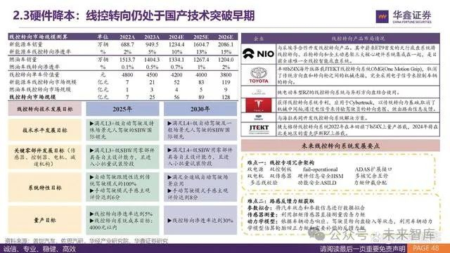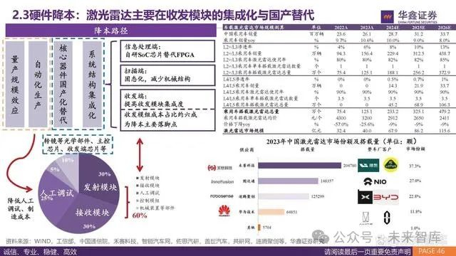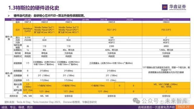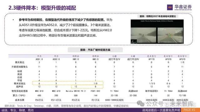 参考华为和特斯拉,在模型迭代升级的情况下减少了传感器的配置。华为 从ADS1.0升级至华为ADS2.0,减少了2个前视摄像头,3个毫米波雷达, 考虑车端算力等其他配置,综合成本预计下降1-2万元。特斯拉从HW2.0 走向HW3.0的过程中,将部分车型毫米波雷达和超声波去掉。