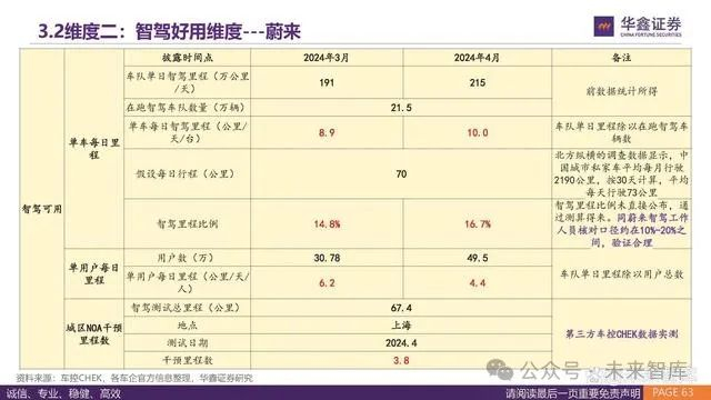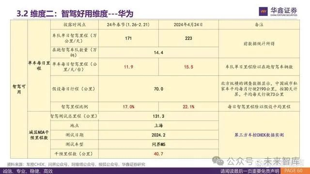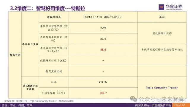 从智驾体验的总结四个核心指标来看:特斯拉的接管里程数上百公里,国内华为和小鹏领先,智驾使用的里程比例分别为22.1%和 20.4%。具体来看,小鹏和理想的数据皆为五一采集,直接可比的情况下,小鹏用户愿意使用智驾的比例显著更高。蔚来和华为的数据 皆为3月数据,直接可比情况下,华为更为领先。 特斯拉在海外路况可以实现326的城区接管里程。根据FSD Community Tracker跟踪数据,FSDV12版本的城区NOA接管里程显著提高。