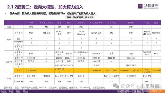 从算法架构来看,各厂商跟随特斯拉走向收敛,感知侧大模型普遍走向BEV+Transfomer+占用网络的架构。 从感知侧算法的推出时间来看,特斯拉领先国内0.5-1.5年时间,华为和小鹏相对靠前。