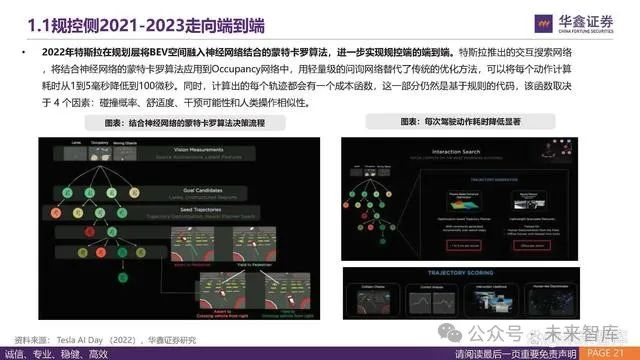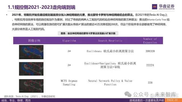 2021年,特斯拉开始在路径规划层面部分加入神经网络的元素,推出蒙特卡罗树与神经网络结合的算法。在2021年的Tesla AI Day上 ,特斯拉用寻找停车场的路径规划作为案例,对比了传统的两种人工规则代码和结合神经网络的第三种算法:推出的Monte-Carlo Tree 结 合神经网络的算法,可以将潜在路径的可扩展次数从传统A*算法的接近40万次降低到288次,但这个阶段并非全部都使用了神经网络, 大部分依然是人工规则代码。
