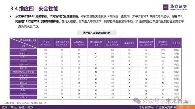 从太平洋的AEB测试来看,华为智驾安全性能靠前。对安全性能关注度从L2开始就一直较高,太平洋智驾AEB测试结果显示,问界M9、 阿维塔12和智界S7均取得G级评级。在行人横穿、倒车遇人等情境下,能够自动触发紧急干预;项目最高通过车速均达到行业最高水平 ,应急情况更广泛。