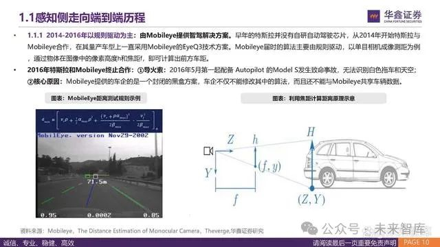 2014-2016年以规则驱动为主:由Mobileye提供智驾解决方案。早年的特斯拉并没有自研自动驾驶芯片,从2014年开始特斯拉与 Mobileye合作,在其量产车型上一直采用Mobileye的EyeQ3技术方案。Mobileye届时的算法主要由规则驱动,以单目相机成像测距为例 ,通过物体在图像中的像素高度h和焦距f,即可计算出前方车距。 2016年特斯拉和Mobileye终止合作:①导火索:2016年5月第一起配备 Autopilot 的Model S发生致命事故,无法识别白色拖车和天空; ②核心原因:Mobileye提供的车企的是一个封闭的黑盒方案,车企不仅不能修改其中的算法,而且还不能与Mobileye共享车辆数据。