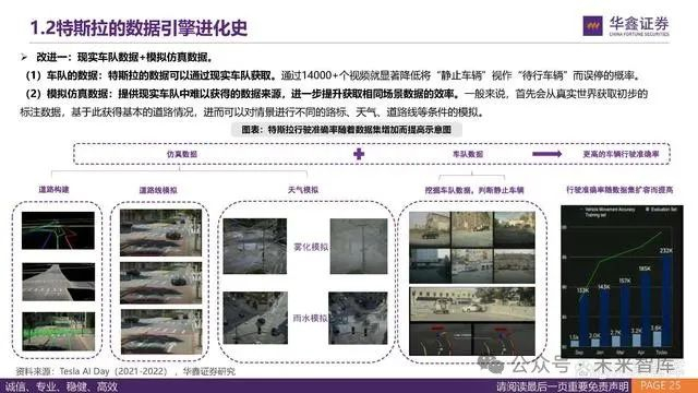 改进一:现实车队数据+模拟仿真数据。 (1)车队的数据:特斯拉的数据可以通过现实车队获取。通过14000+个视频就显著降低将“静止车辆”视作“待行车辆”而误停的概率。 (2)模拟仿真数据:提供现实车队中难以获得的数据来源,进一步提升获取相同场景数据的效率。一般来说,首先会从真实世界获取初步的 标注数据,基于此获得基本的道路情况,进而可以对情景进行不同的路标、天气、道路线等条件的模拟。