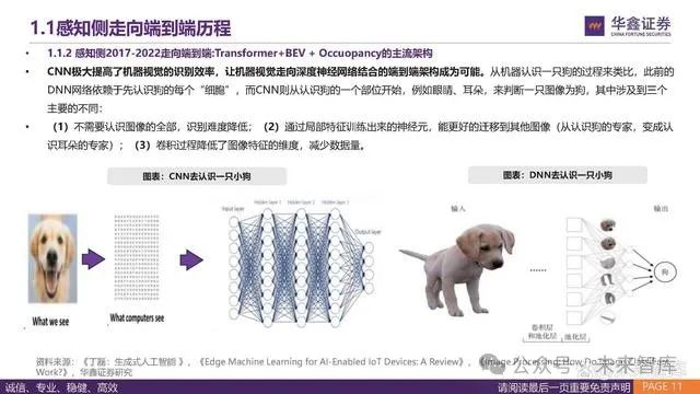 CNN极大提高了机器视觉的识别效率,让机器视觉走向深度神经网络结合的端到端架构成为可能。从机器认识一只狗的过程来类比,此前的 DNN网络依赖于先认识狗的每个“细胞”,而CNN则从认识狗的一个部位开始,例如眼睛、耳朵,来判断一只图像为狗,其中涉及到三个 主要的不同: (1)不需要认识图像的全部,识别难度降低;(2)通过局部特征训练出来的神经元,能更好的迁移到其他图像(从认识狗的专家,变成认 识耳朵的专家);(3)卷积过程降低了图像特征的维度,减少数据量。
