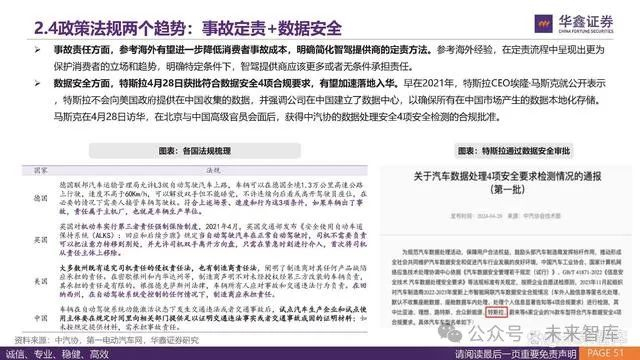 事故责任方面,参考海外有望进一步降低消费者事故成本,明确简化智驾提供商的定责方法。参考海外经验,在定责流程中呈现出更为 保护消费者的立场和趋势,明确特定条件下,智驾提供商应该更多或者无条件承担责任。 数据安全方面,特斯拉4月28日获批符合数据安全4项合规要求,有望加速落地入华。早在2021年,特斯拉CEO埃隆·马斯克就公开表示 ,特斯拉不会向美国政府提供在中国收集的数据,并强调公司在中国建立了数据中心,以确保所有在中国市场产生的数据本地化存储。 马斯克在4月28日访华,在北京与中国高级官员会面后,获得中汽协的数据处理安全4项安全检测的合规批准。