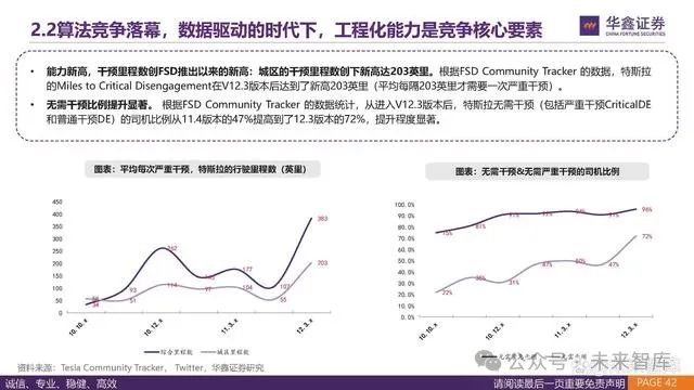 能力新高,干预里程数创FSD推出以来的新高:城区的干预里程数创下新高达203英里。根据FSD Community Tracker 的数据,特斯拉 的Miles to Critical Disengagement在V12.3版本后达到了新高203英里(平均每隔203英里才需要一次严重干预)。 无需干预比例提升显著。 根据FSD Community Tracker 的数据统计,从进入V12.3版本后,特斯拉无需干预(包括严重干预CriticalDE 和普通干预DE)的司机比例从11.4版本的47%提高到了12.3版本的72%,提升程度显著。