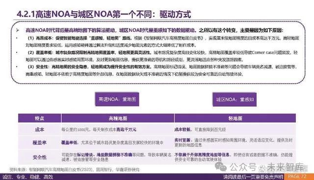 高速NOA时代背后是高精地图下的算法驱动,城区NOA时代是重感知下的数据驱动。之所以有这个转变,主要是因为如下原因:(1)高昂成本:促使智能驾驶选择“重感知,轻地图”路线。根据《智能网联汽车高精度地图白皮书》,实现厘米级地图精度的日成本高达千万元。而轻地图 对地图精度要求较低,运用感知硬件通过算法升级和适度减少地图元素的方式大幅降低了制作成本。(2)覆盖率低:城市复杂路况限制高精地图覆盖率,轻地图更具灵活性。城市路况复杂度高且变化较快,高精地图覆盖率较低导致Corner case问题频发。轻 地图可以通过传感器实时感知周围环境,及时更新地图信息,提供更准确的导航和路径规划,更灵活地适应各种突发道路因素。(3)安全性:高精地图的安全隐患,轻地图成为提升安全性的有效方案。高精地图标记错误、地图数据拼接不准确等问题会导致车辆莫名减速、被迫接管等, 而重感知、轻地图不依赖于高精度地图等外部信息,在地图数据缺失或不准确的情况下仍能提供较为安全可靠的自动驾驶体验。
