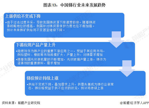 为了保护我国锑资源,确保我国锑行业可持续性发展,短期内我国锑供给量将维持不变甚至下调,然而下游需求市场,如阻燃剂、光伏玻璃等产量增加将使得锑需求上涨,从而导致供需缺口将进一步扩大,供需失衡或将成为锑行业新常态,预计锑价将持续上升。