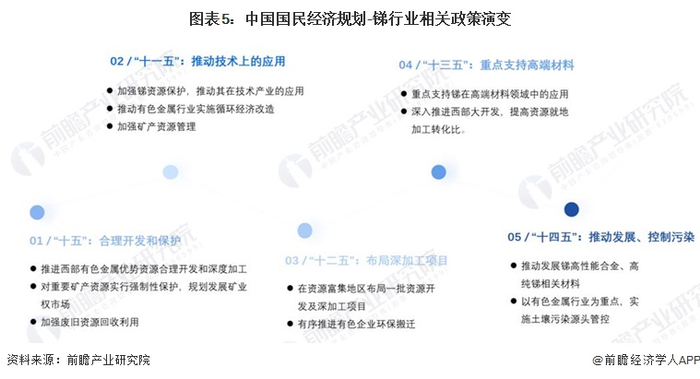 锑行业前期发展受限于工业水平,相关政策主要以开发和保护为主。随着我国工业水平的不断上升,以及西部大开发的不断深入,国家对于锑越发重视,尤其是当战略性新兴产业发展被提上日程后,锑产品的重要性越发得到体现;同时国家对于环境保护的要求越发提高,对于锑造成的污染也非常重视并制定了治理的相关目标及要求。