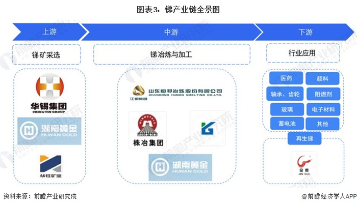 我国锑行业起步很早,目前已经形成了从采选到应用的完整的产业链,其中,再回收作为锑资源应用的重要一环,也是产业链中不可或缺的部分。锑产业链上游主要是锑矿的开采以及选取,产物为锑精矿;中游主要为锑的冶炼与加工,锑精矿经过冶炼后将成为锑锭,可以用来加工为高纯金属锑、锑合金、硫化锑等;下游应用主要包括阻燃剂、光伏玻璃、蓄电池等。此外,蓄电池中的锑可以进行回收,作为再生锑,重新进行冶炼和加工。