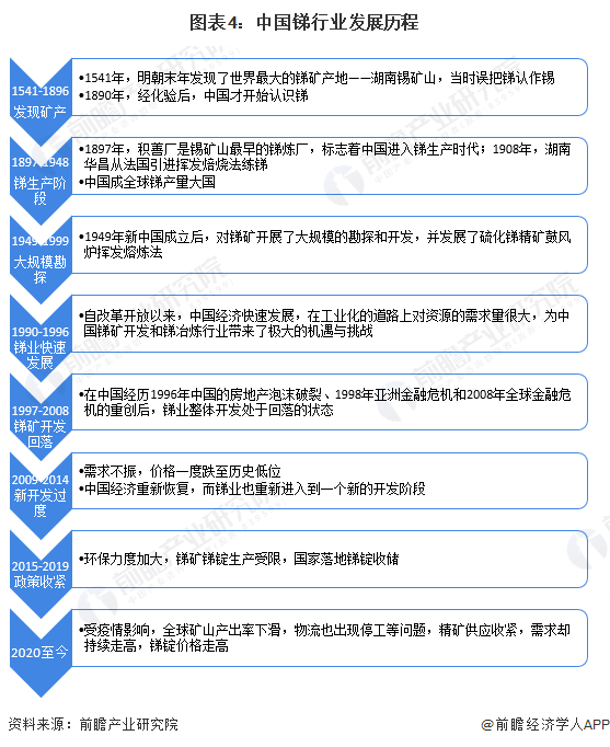 中国锑行业发展较早,1541年,中国明朝已发现世界最大的锑矿产地,至1897年,中国开始生产锑并迅速成为全球锑产量大国;1949-1996年,中国经济快速发展,对锑矿展开大规模的勘探开发,且工业化道路上的中国对锑需求量增大。1997-2014年,中国经济经过一系列的击打,对锑业也产生了一定的负面影响,需求不振。2015-2019年,中国环保意识加强,国家迈入可持续发展的道路,环保政策力度加大并落地锑矿收储。自2020年疫情爆发以来,矿采和物流存在一定的问题,供不应求,导致锑锭价格一路走高。