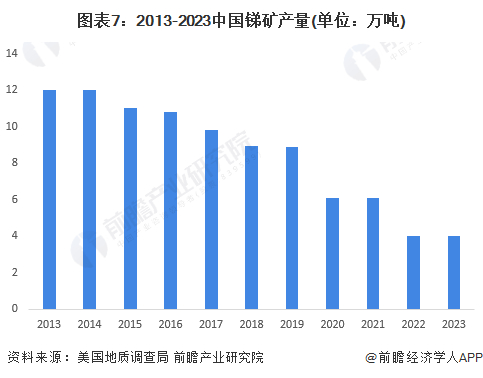 随着锑矿战略地位的不断上升,环保意识的不断加强,以及锑矿收储政策的落地,我国锑矿供给量连续十年下降,2013-2023年,我国锑矿产量从12万吨下降至4万吨,下降幅度达到66.67%。