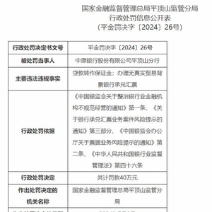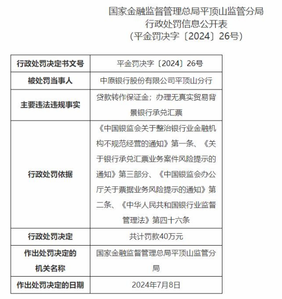 中国经济网北京7月20日讯 国家金融监督管理总局网站近日发布的国家金融监督管理总局平顶山监管分局行政处罚信息公开表(平金罚决字〔2024〕26号)显示,中原银行股份有限公司平顶山分行存在以下违法违规事实:贷款转作保证金;办理无真实贸易背景银行承兑汇票。根据《中国银监会关于整治银行业金融机构不规范经营的通知》第一条、《关于银行承兑汇票业务案件风险提示的通知》第三部分、《中国银监会办公厅关于票据业务风险提示的通知》第二条、《中华人民共和国银行业监督管理法》第四十六条的规定,国家金融监督管理总局平顶山监管分局决定对其处以罚款40万元。