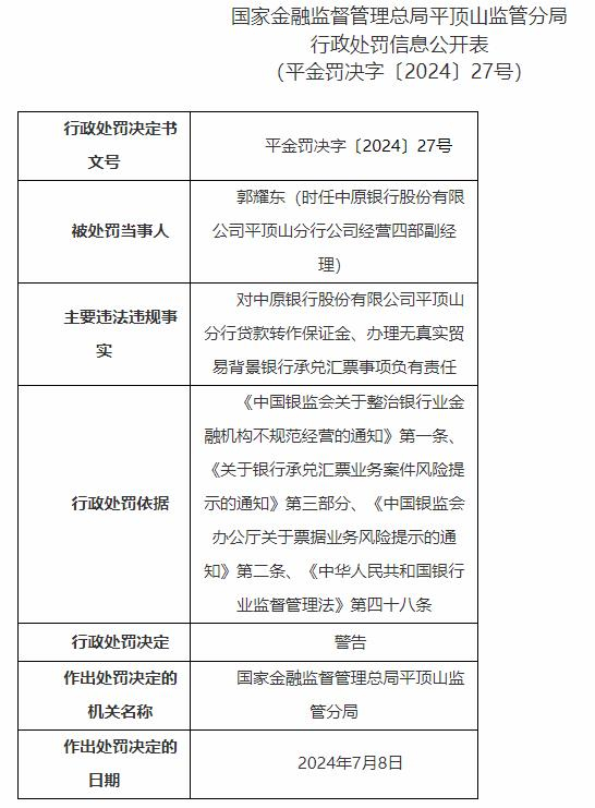 国家金融监督管理总局平顶山监管分局行政处罚信息公开表(平金罚决字〔2024〕27号)显示,郭耀东(时任中原银行股份有限公司平顶山分行公司经营四部副经理)对中原银行股份有限公司平顶山分行贷款转作保证金、办理无真实贸易背景银行承兑汇票事项负有责任。根据《中国银监会关于整治银行业金融机构不规范经营的通知》第一条、《关于银行承兑汇票业务案件风险提示的通知》第三部分、《中国银监会办公厅关于票据业务风险提示的通知》第二条、《中华人民共和国银行业监督管理法》第四十八条的规定,国家金融监督管理总局平顶山监管分局决定对其处以警告。