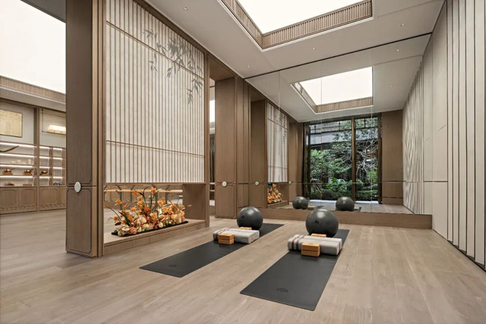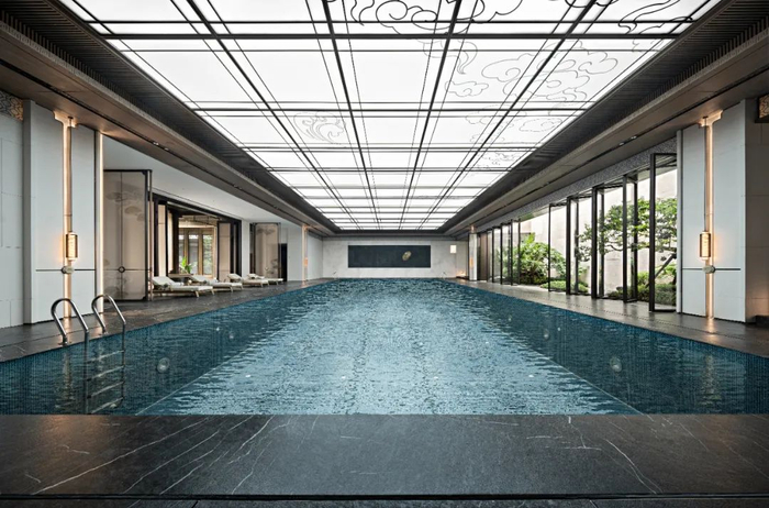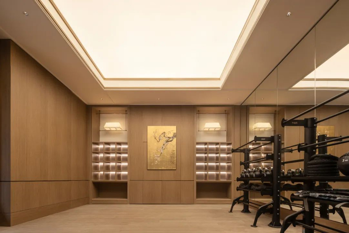 下沉式主题会所,延续了中轴归家仪式感,由浅至深,礼序铺展而出。瑜伽室、休闲区、泳池、茶室等设施一应俱全,致敬业主的尊崇身份。