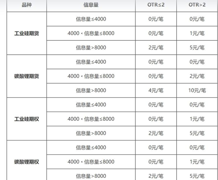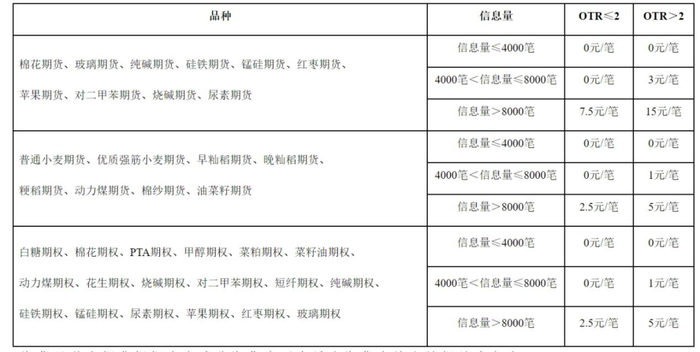 其中,期货品种申报费根据客户或非期货公司会员在期货合约上的报单成交比(Order to Trade Ratio,OTR)所在区间以及信息量分梯度计算;期权品种申报费根据客户或非期货公司会员在期权合约月份上的报单成交比所在区间以及信息量分梯度计算。