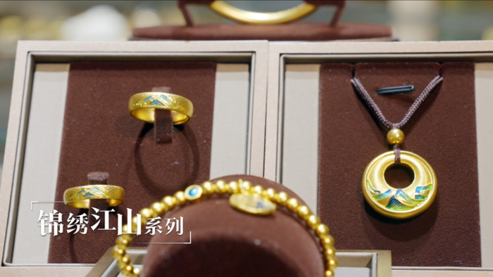 现在的消费者喜欢什么样式的珠宝款式?朱迅在这次探店过程中获得了答案——伴随着生活场景越来越多元化,年轻一代的消费观念正悄然蜕变,年轻人倾向于追求彰显个性风采、融合创新趣味且品质卓越的珠宝作品。在这里,我们看到周大生从《千里江山图》中获取设计启发,以《千里江山图》中标志性的青绿色彩和山水元素为设计灵感,注入国家宝藏×周大生IP联名系列新品中,高度提炼画卷中的壮阔河山和色彩元素,将百年前北宋壮阔秀美的山水图在珠宝上再现,古今联结传承匠心独运,在细节的打磨中让国宝精髓千古不朽。国风多巴胺黄金首饰,老祖宗的审美我悟了!
