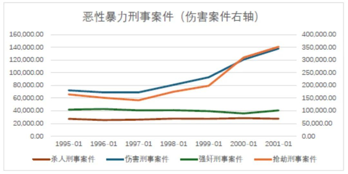 那一段历史和现在有很多相似之处,虽然程度和表现略有区别,但财政困难、产能过剩、银行坏账、严重通缩、大面积失业是共性,如果我们锚定 95-01年这六年时间,那段时间的犯罪表现是什么样的?