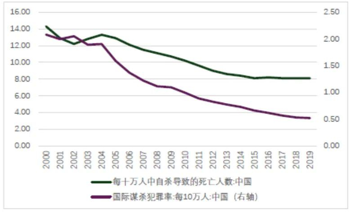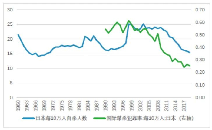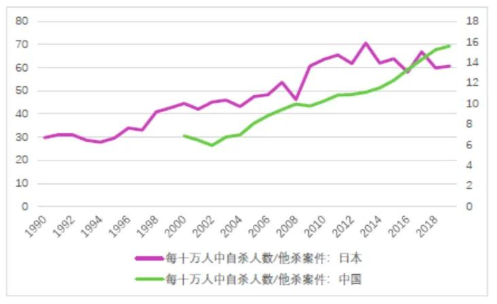 也正因为此,从统计上可以看出来,日本从 90年代每30人自杀才会有一起谋杀案件,到现在每60 人自杀会有一起谋杀案件,而对比中国,在 20 世纪初每6个人自杀就会出现一起谋杀案件,到 20年也才变为每 16 人自杀出现一起谋杀案件。