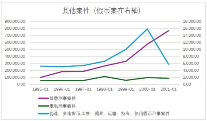 从最高检对中国近 20年的刑事案件办案介绍中,我们可以猜测其他刑事案件中类似醉驾、危险驾驶、寻衅滋事、伪劣产品、扰乱市场秩序等罪名大量增加,尤其是在加入 WTO 之前,对于涉及知识产权、市场经济的案件可能有了突击式的立案办理另外,假币案件就非常有意思了,可以看到虽然 95 年到 00年假币案件飙升,在2000 年后假币案大幅度降低,主要原因是99年下半年全国推行了较难仿制的第五套人民币。
