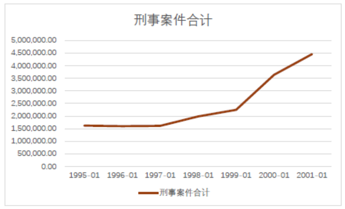 首先,刑事案件总数这个过程中是大幅上升的,从 1995 年 150 万件,到 2001年已经达到 450 万件,涨了三倍。