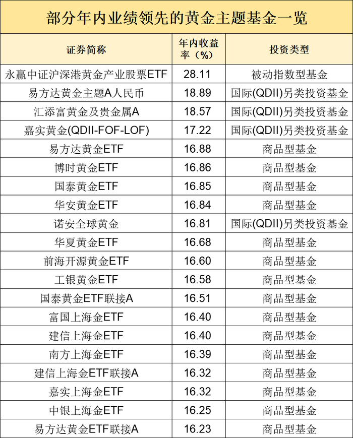 涨幅排在黄金股ETF之后的,是多只QDII类黄金基金。易方达黄金主题A、汇添富黄金及贵金属A、嘉实黄金分别取得18.89%、18.57%、17.22%的年内回报。
