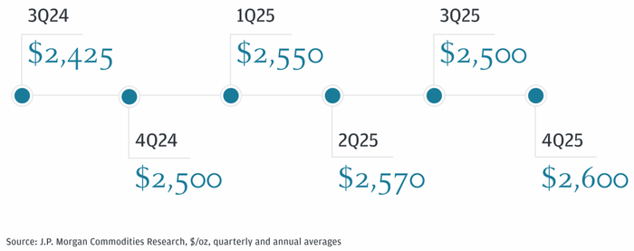 摩根大通发布研报表示,黄金的结构性牛市仍保持不变。摩根大通基本和贵金属策略主管格雷戈·席勒(Gregory Shearer)认为,未来几个季度黄金价格趋势仍然向上,预计今年四季度的平均价格为2500美元/盎司,2025年将达到2600美元/盎司。