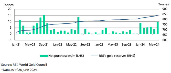 目前,印度储备银行的黄金储备已达到创纪录的840.7吨,占外汇储备总额的8.7%,显著高于一年前的7.4%。