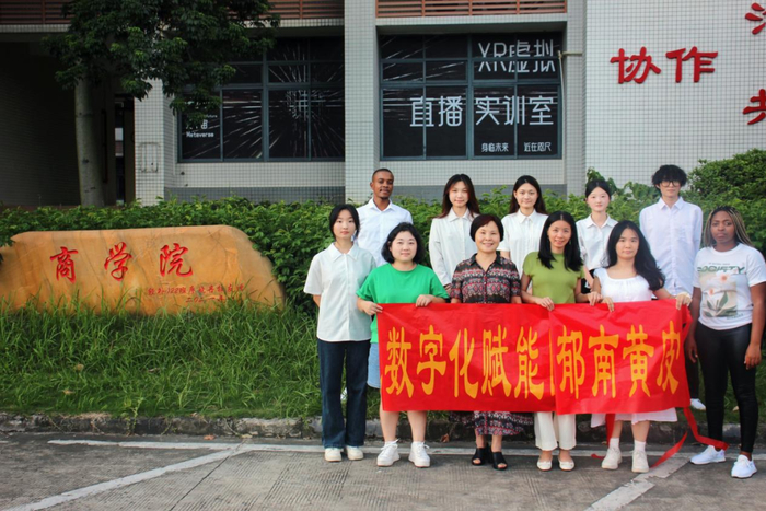 “黄皮变金果”-数商兴农突击队由商学院党总支书记和商学院院长牵头,学院副院长、学院团委书记、电子商务谢名英和辅导员加入指导老师队伍,组建2名南非留学生和18名商学院团委和学生会干部前往云浮郁南县开展郁南黄皮电商直播,推进郁南县黄皮特色农产品的推广。