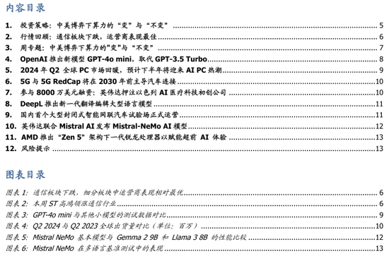 大模型厂商百家争鸣,openAI不断优化:微软正在研发5000亿参数的MAI-1大模型;谷歌发布了其第二代大语言模型Gemma 2,参数规模达270亿;Meta于2024年4月发布LLama3模型,相比Llama2模型训练数据集更大、支持上下文更长。同时Open AI也在不断优化GPT-4o模型,在7月18日推出一款新的 AI 模型“GPT-4o mini”,是GPT-4o的低参数、低成本版本,在文本智能和多模态推理的基准测试中表现出了较强性能。