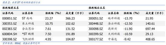 本周,受益车联网概念,ST高鸿上涨23.27%,领涨版块。受益工业互联网领域的先发布局,东土科技上涨10.75%;受益北斗导航、无人驾驶概念,合众思壮上涨7.61%;受益资产重组预期,*ST鹏博上涨7.50%;受益半导体材料创新,飞凯材料上涨4.95%。