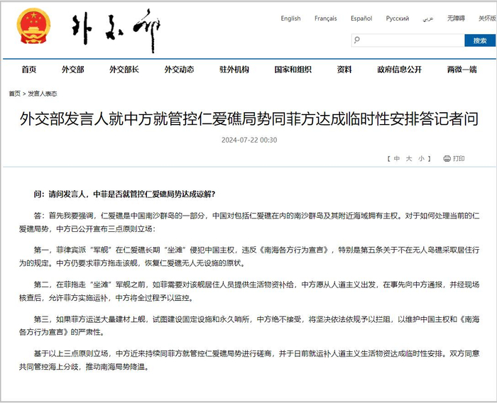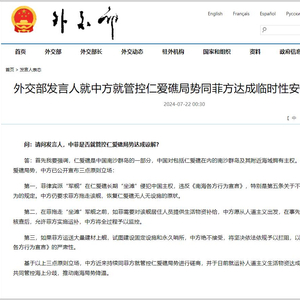 据外交部网站22日消息,外交部发言人就中方就管控仁爱礁局势同菲方达成临时性安排答记者问。