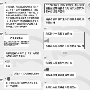 海康威视旗舰店客服人员与钟先生6月13日的聊天记录显示:“因海康威视总部服务器升级,为提升监控网络信息安全,以及产品客户端云服务使用体验升级,部分非4G监控摄像头将于2022年3月1日之后禁止单独添加至软件客户端云服务使用(已添加绑定产品未操作解绑不受影响)。”钟先生告诉记者,客服人员给他推荐了一款录像机,折后价332元。钟先生不想再买录像机,提出要店铺免费提供录像机,或更换同类可以使用的产品,或退货退款等诉求,均被对方拒绝。