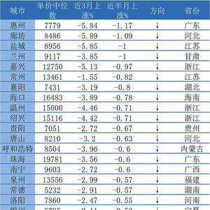 从近3个月涨幅来看:样本三线城市中,廊坊(-5.89%)、盐城(-5.85%)、惠州(-5.84%)等城市下跌幅度较大,太原(-1.49%)、常州(-1.55%)、银川(-2.11%)等城市下跌幅度较小。